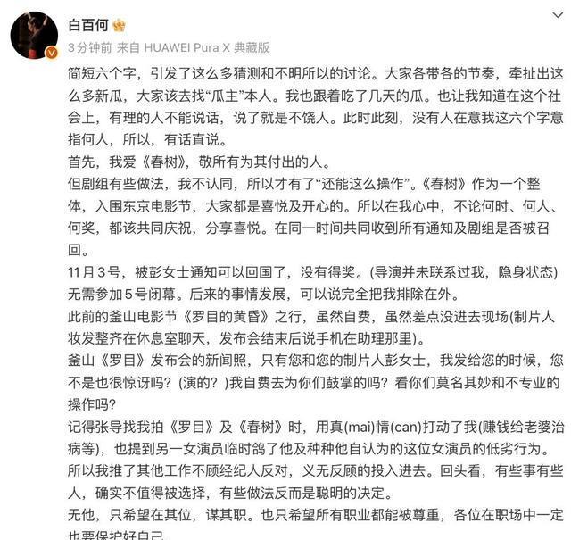 到了11月6号,也就是颁奖结束第二天,白百何干脆发了篇长文,把心里的不满全倒了出来。