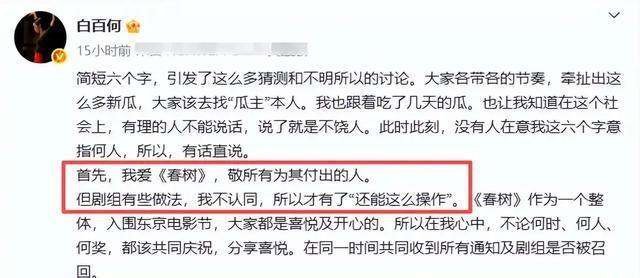制片人彭瑾说,《春树》获奖的消息,她一从影展那边得到通知就告诉剧组了,白百何团队是明确收到消息的。